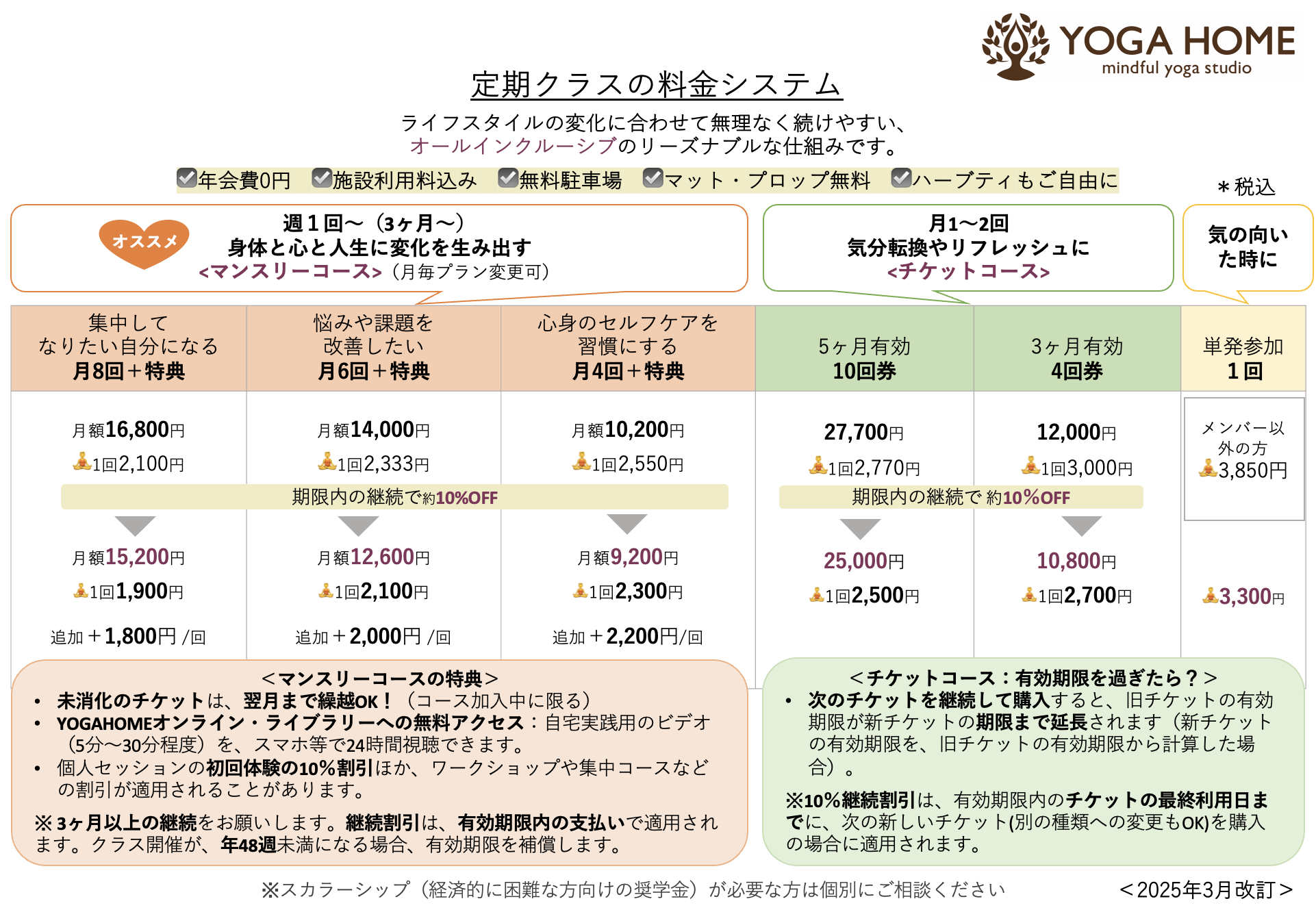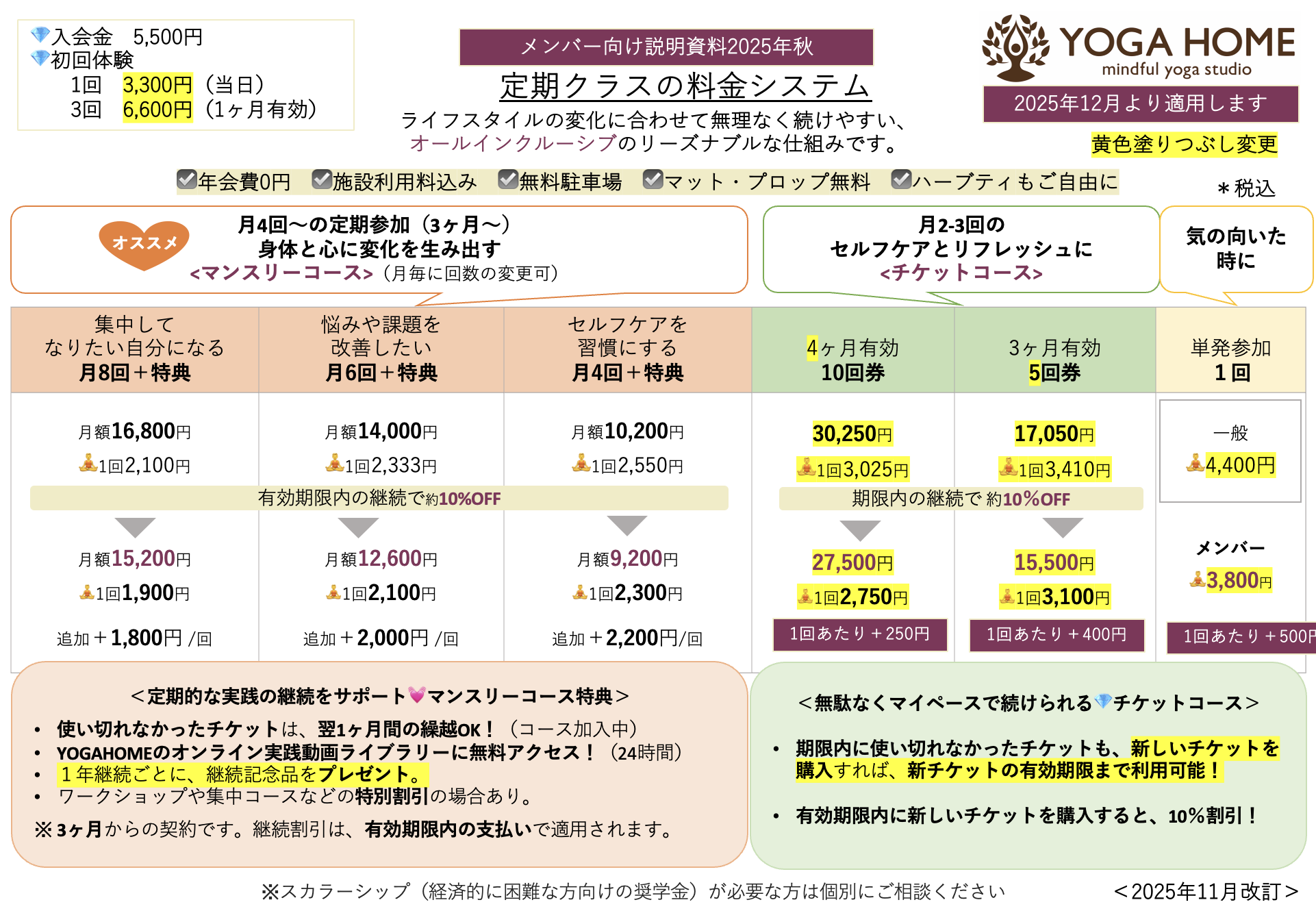 以下の変更は、YOGAHOMEメンバーの皆さんに対しては、2025年12月から適用させていただきます。(非会員及び本日以降の初回体験者に対しては、本日以降の適用)