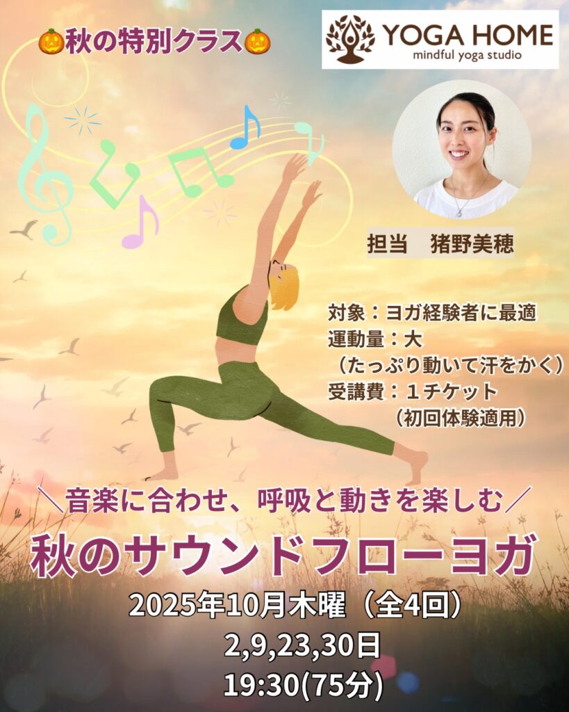 ※2025年は3ヶ月ごとに、春夏秋冬のテーマに合ったサウンドフローヨガをアクティブヨガ(木曜19時30分)の枠で展開しています。10月は秋バージョンをお楽しみください!