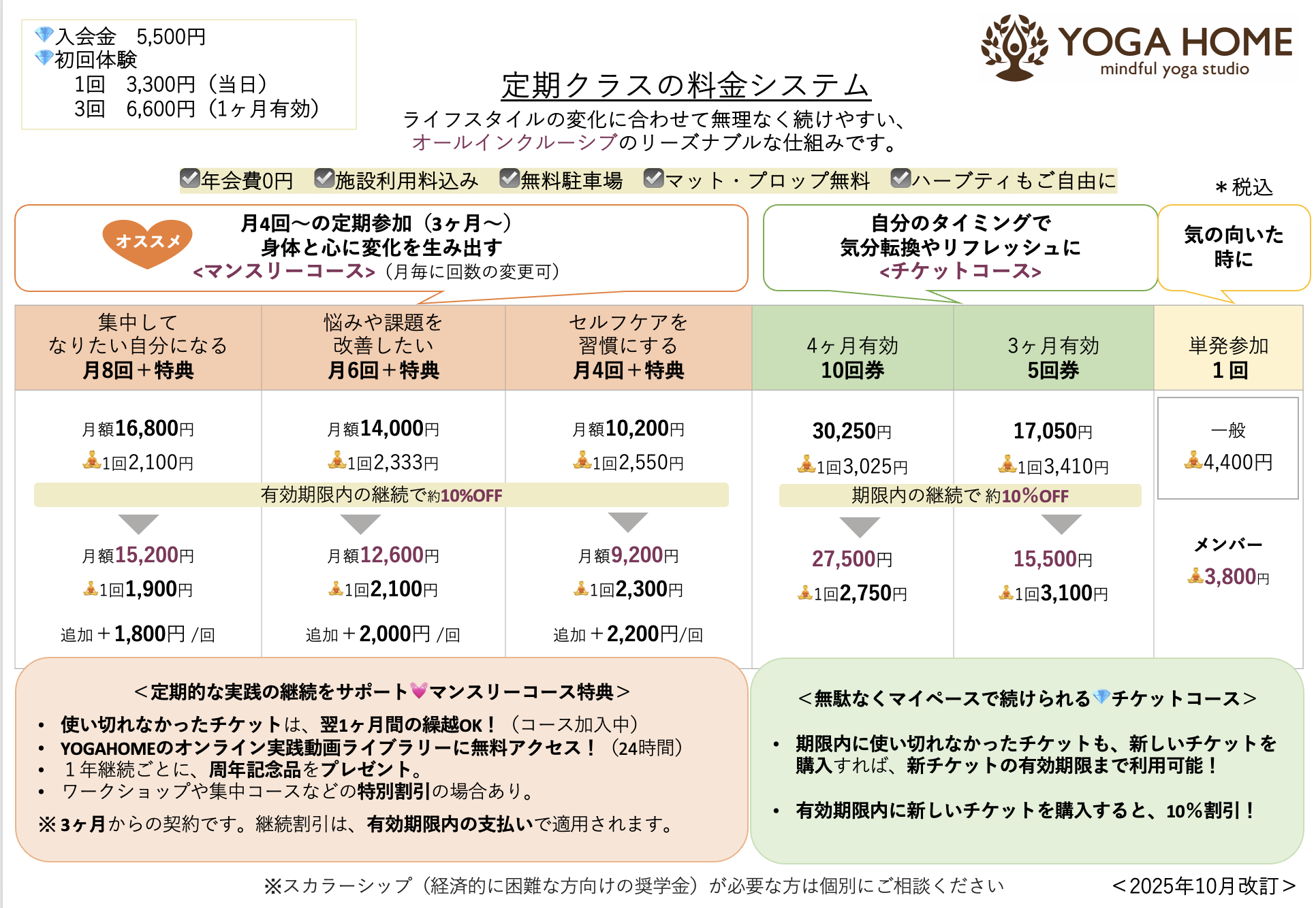 YOGAHOMEの定期クラスの参加方法は、月会費制のマンスリーコース、自由に頻度を選べるチケットコースと多彩で、ライフスタイルの変化に合わせて無理なく継続しやすい、リーズナブルな料金システムです。